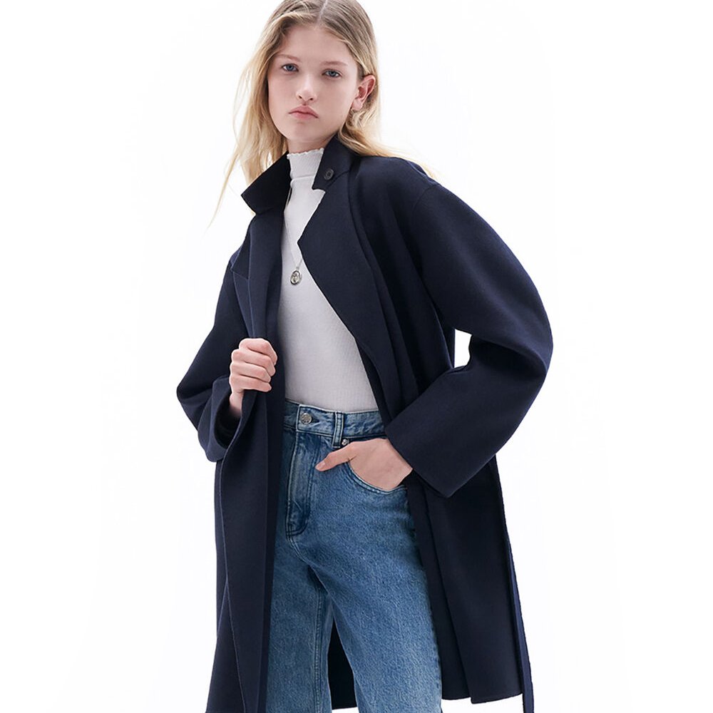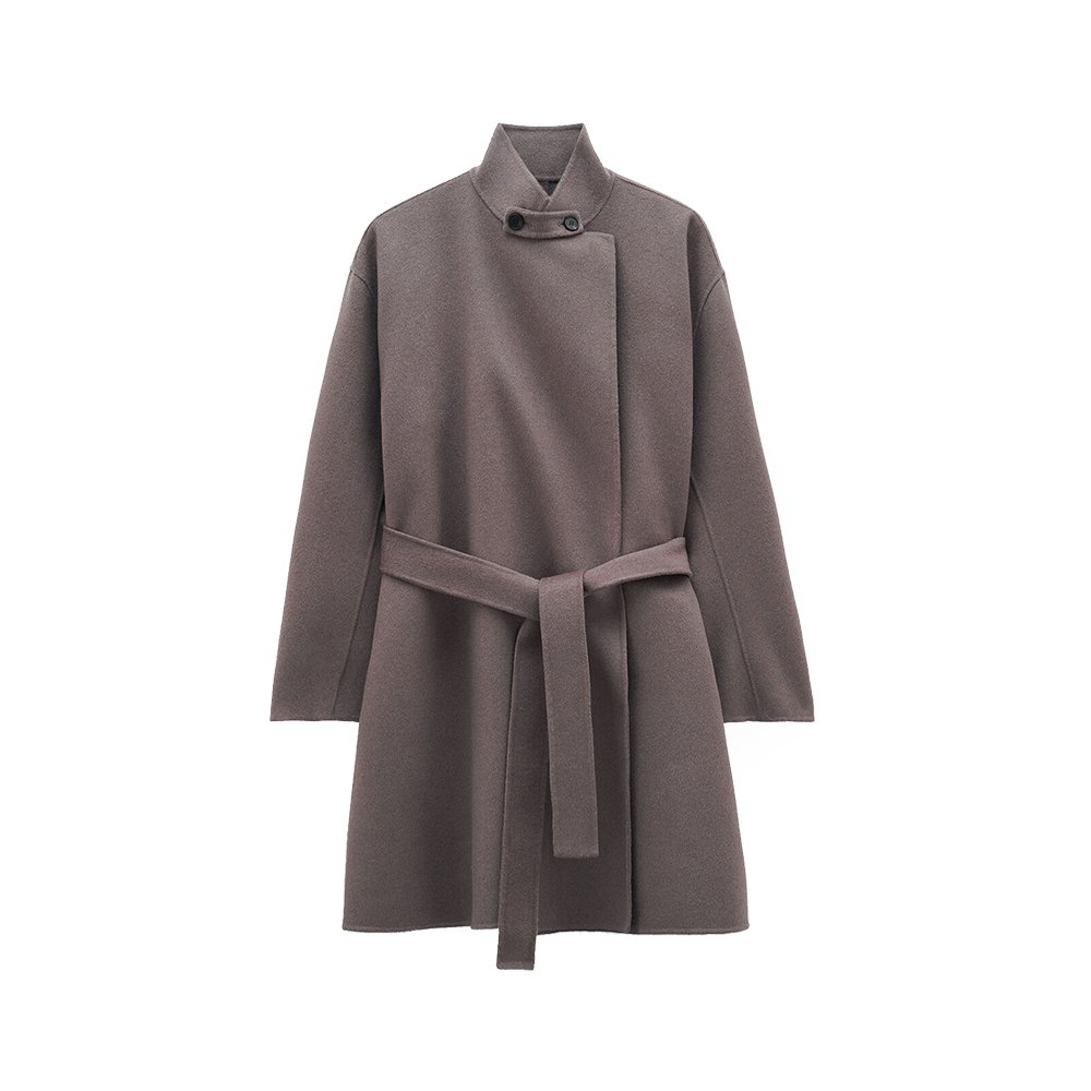 - Ungefüttert, abnehmbare Kragenlasche, Gürtel in der Taille, Seitentaschen