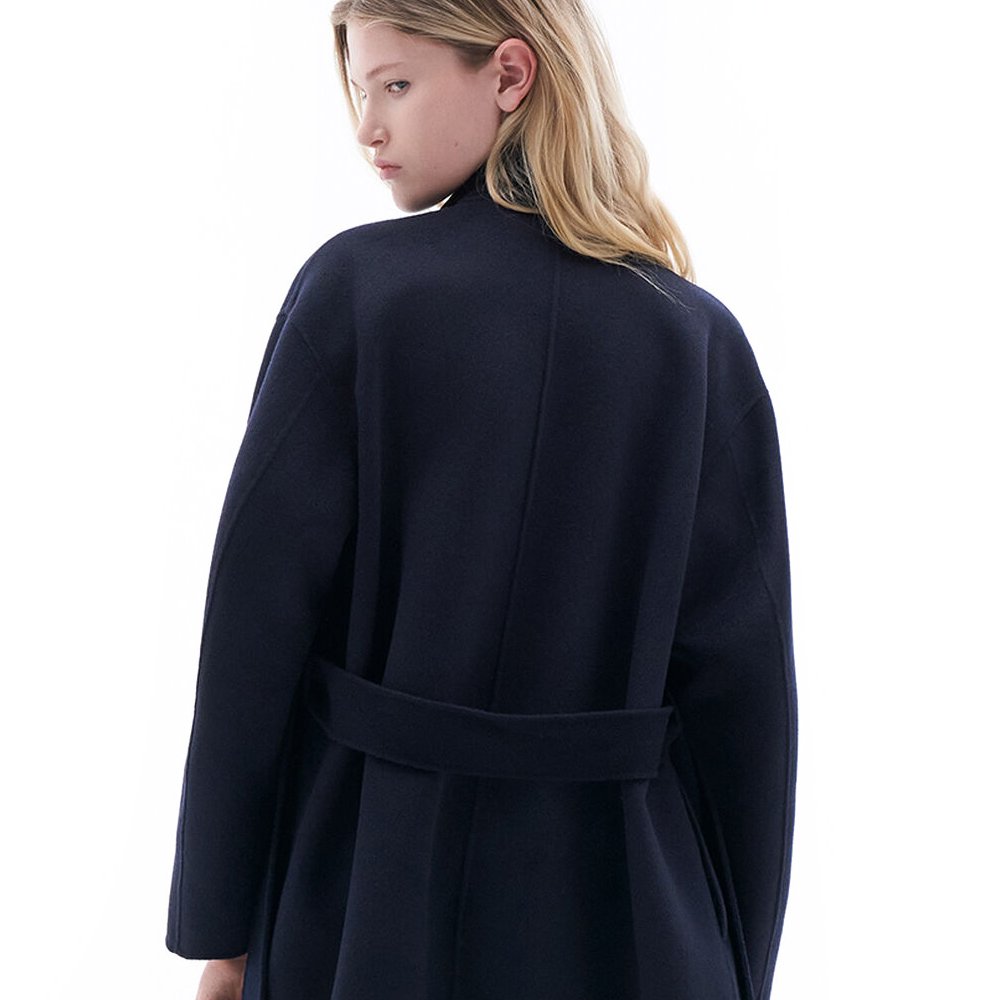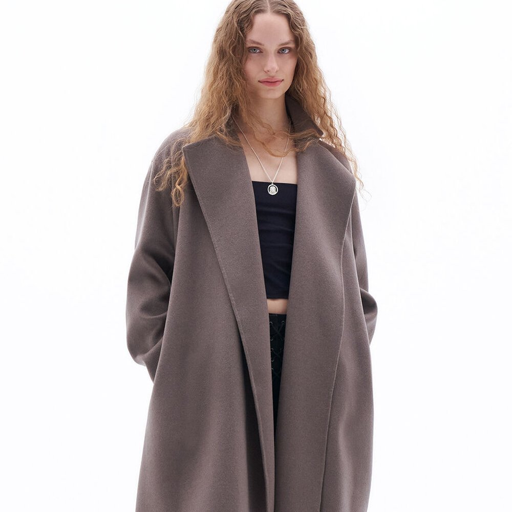Übergroße Wickeljacke aus doppelseitiger gebürsteter Wolle und Kaschmir mit handgenähten Kanten. Entworfen mit einer übergroßen Passform.