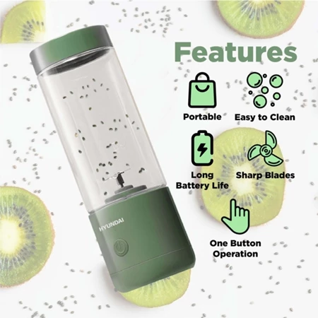 Hyundai Portable Fruit Blender Portable Extractor Blender Mini Electric Ice Crusher USB Rechargeable 4 Blades 400ml