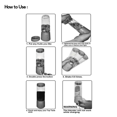 * For the first time use, make sure the battery is fully charged, and thoroughly clean the parts containing with fruit